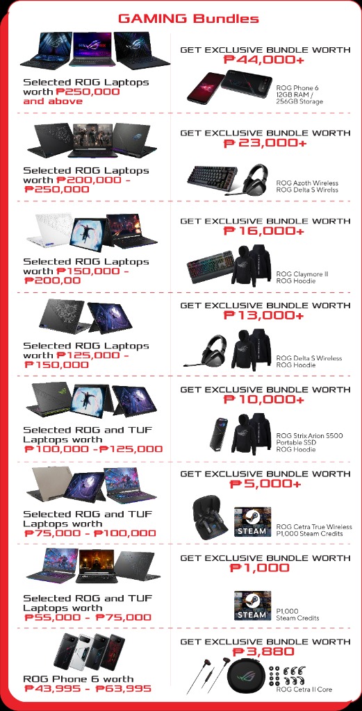 TUF Advantage Edition - For those looking for a cheaper gaming laptop, then this one's for you. Featuring AMD’s latest generation both for CPU and GPU, this laptop capitalizes exclusive features including AMD Smart Technology and AMD’s Freesync Premium technology for seamless gaming experience. You’ll also get an ROG Cetra Wireless and 1,000 PHP worth of Steam credits to jump start your gaming action!