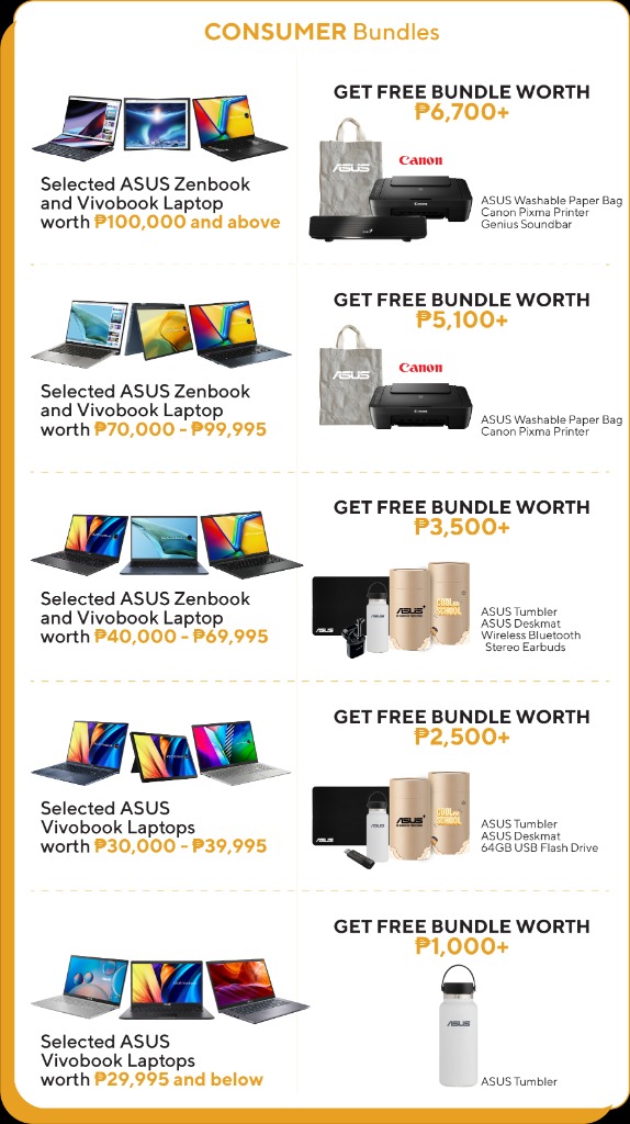 Zenbook S 13 (UM5304) - The Zenbook S 13 is ASUS 'answer to Dell’s XPS 13 but at a much lower cost. This slim laptop is equipped with Intel’s latest 13th Gen CPU, that is both efficient and powerful. This also features an OLED display well suited for content consumption or even light editing with its wide color gamut. Bundled to this laptop is a compact Canon PIXMA printer and an exclusive ASUS washable tote.