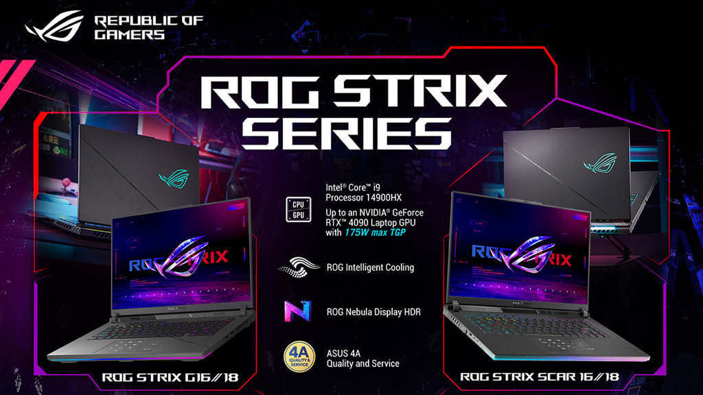 ASUS Republic of Gamers today announced the 2024 Strix family of laptops, including the Strix SCAR 18, the first 18-inch ROG laptop equipped with the mini–LED ROG Nebula HDR Display. As the vanguard of gaming laptops, all 2024 Strix machines feature the latest flagship Intel® Core™ i9 processor 14900HX, with the Strix SCAR 18 sporting up to an NVIDIA® GeForce RTX™ 4090 Laptop GPU with 175W max TGP. Paired with a complete suite of the latest intelligent cooling improvements, including Tri-Fan technology and Conductonaut Extreme liquid metal on both the CPU and GPU, the 2024 Strix family of laptops has arrived to dominate the competition.