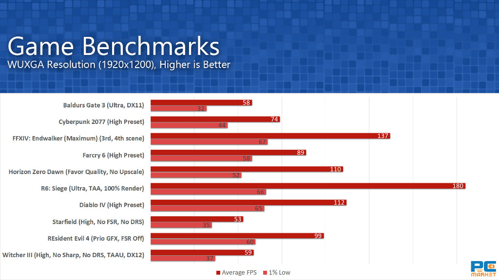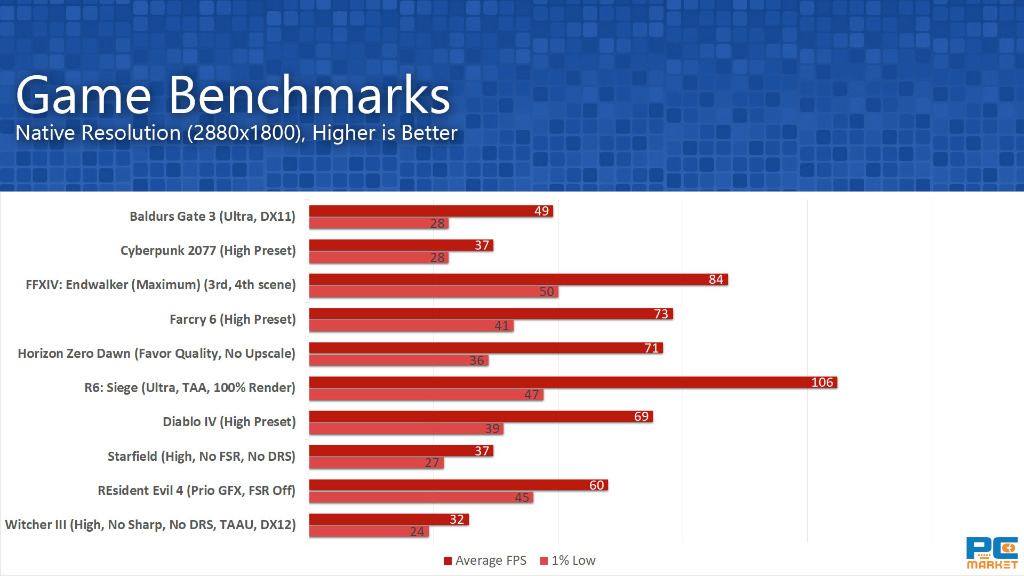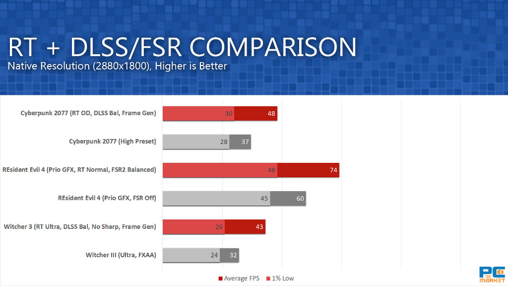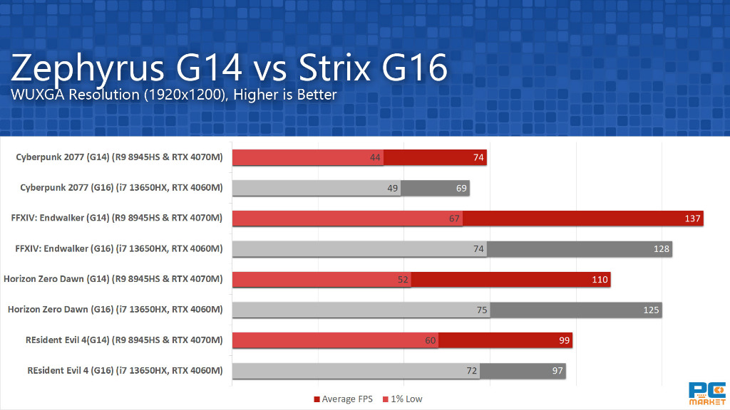 Gaming performance on the G14 is also a mixed bag, on one hand you can comfortably run a lot of triple A titles above 60 FPS on a 16:10 equivalent of 1080p gaming but if we run those games natively then a lot of these games would struggle unless you would opt to run it on lower visual fidelity or if the game can utilize super sampling technology such as DLSS or FSR. A very good example here is in Resident evil 4 wherein the frames are much better even with Ray Tracing turned on and visually the game still looks fantastic. Another good example is Witcher 3, while this game is a little bit dated already, you can still see that GPUs are still struggling to run this game on a good frame rate and with DLSS and Frame Gen, I was able to increase the game's average FPS by around 35% and again with Ray tracing on. Surprisingly if I compare this to the Strix G16 I reviewed last year, the difference is only small given that the Strix laptop only uses a 4060 GPU. Main reason for that is that the G14 is power limited both to the CPU and GPU given its form factor hence severely power throttling the GPU to 75W in most of the time. And if you don't mind the additional noise then you could always set the power profile to turbo for extra performance though unfortunately I was not able to test it out due to time constraints.